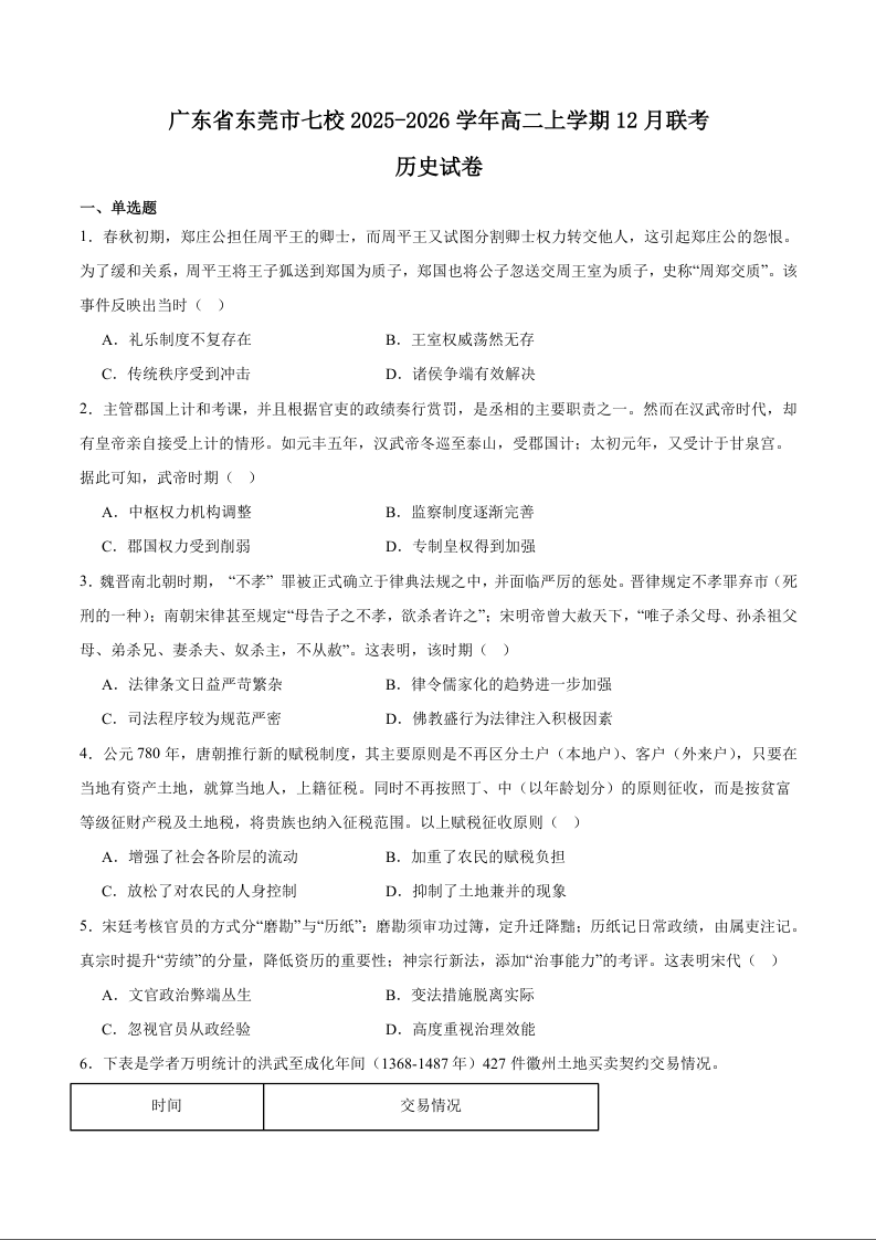 广东省东莞市七校2025-2026学年高二上学期联考 历史试卷(含答案).docx