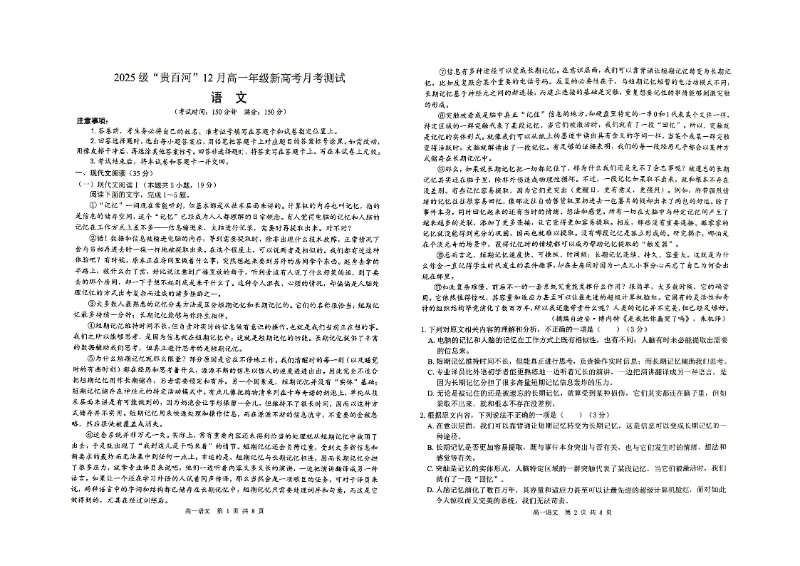 广西壮族自治区“贵百河”2025级12月高一年级新高考月考测试 语文.pdf