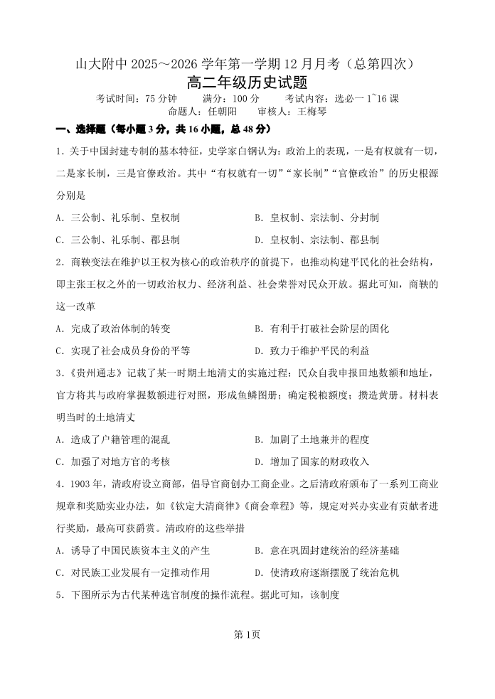 山西大学附中2025-2026学年第一学期高二(12月)月考(总第四次)历史.pdf