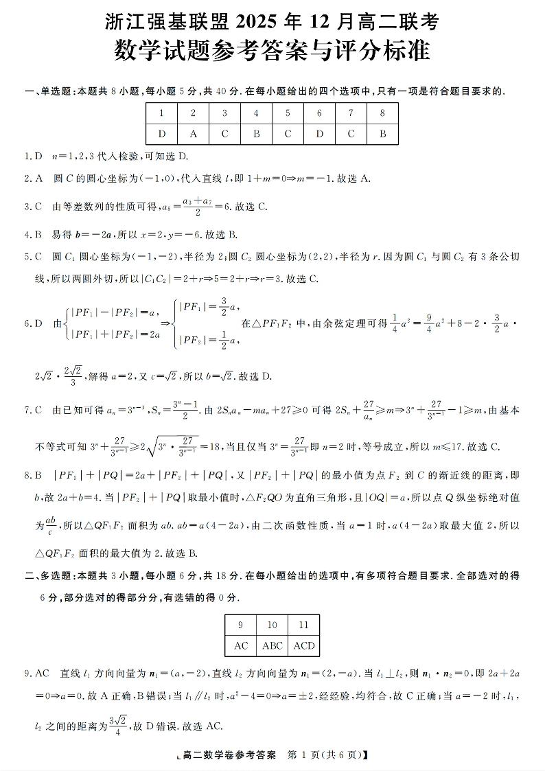 浙江省强基联盟2025年12月高二联考 数学答案.pdf