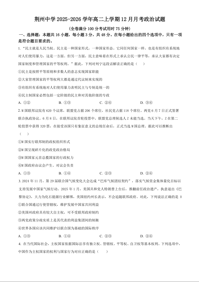 湖北省荆州中学2025-2026学年高二上学期12月月考 政治.docx