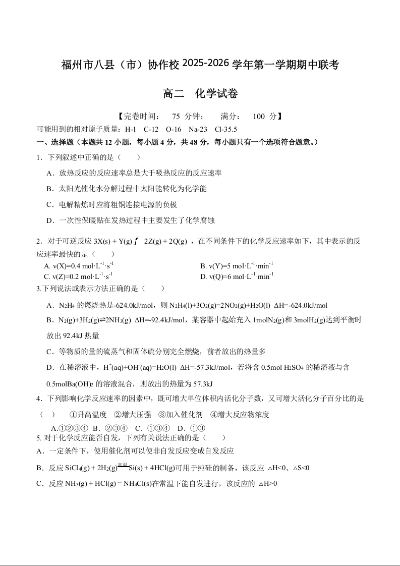 福建省福州市八县(市)协作校2025-2026学年高二上学期期中联考 化学试题(含答案).docx