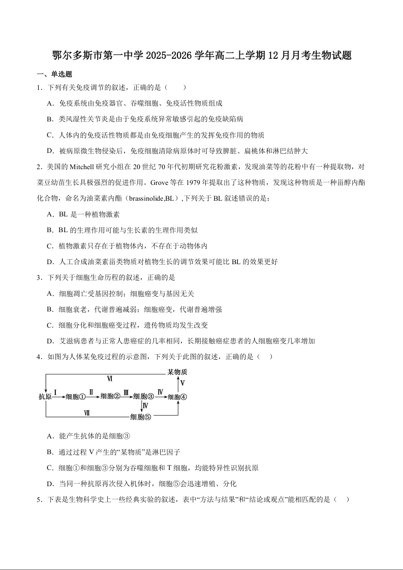 内蒙古自治区鄂尔多斯市第一中学2025-2026学年高二上学期12月月考 生物.docx