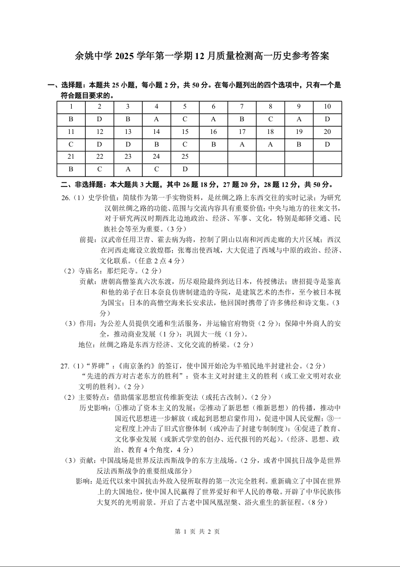 余姚中学2025学年第一学期高一年级12月质量检测 历史答案.docx