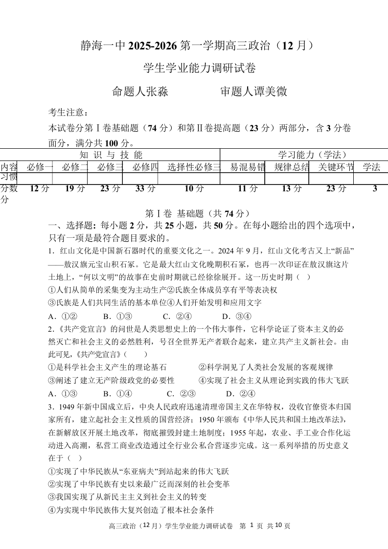 天津市静海区第一中学2026届高三上学期12月月考 政治试题(含答案).docx