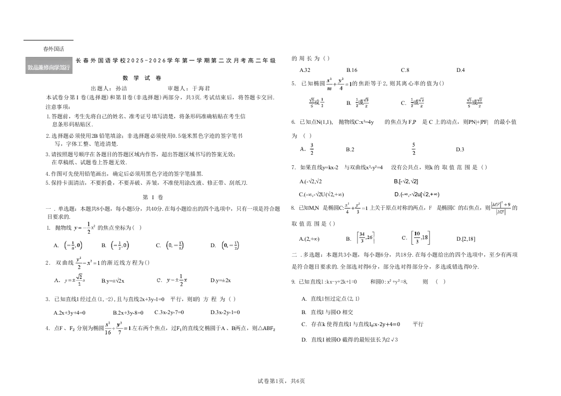 长春外国语学校2025-2026学年第一学期高二年级第二次月考 数学试题(含答案).docx