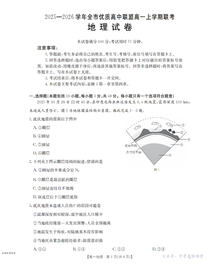 内蒙古赤峰市2025-2026学年全市优质高中联盟高一上学期联考 地理.pdf