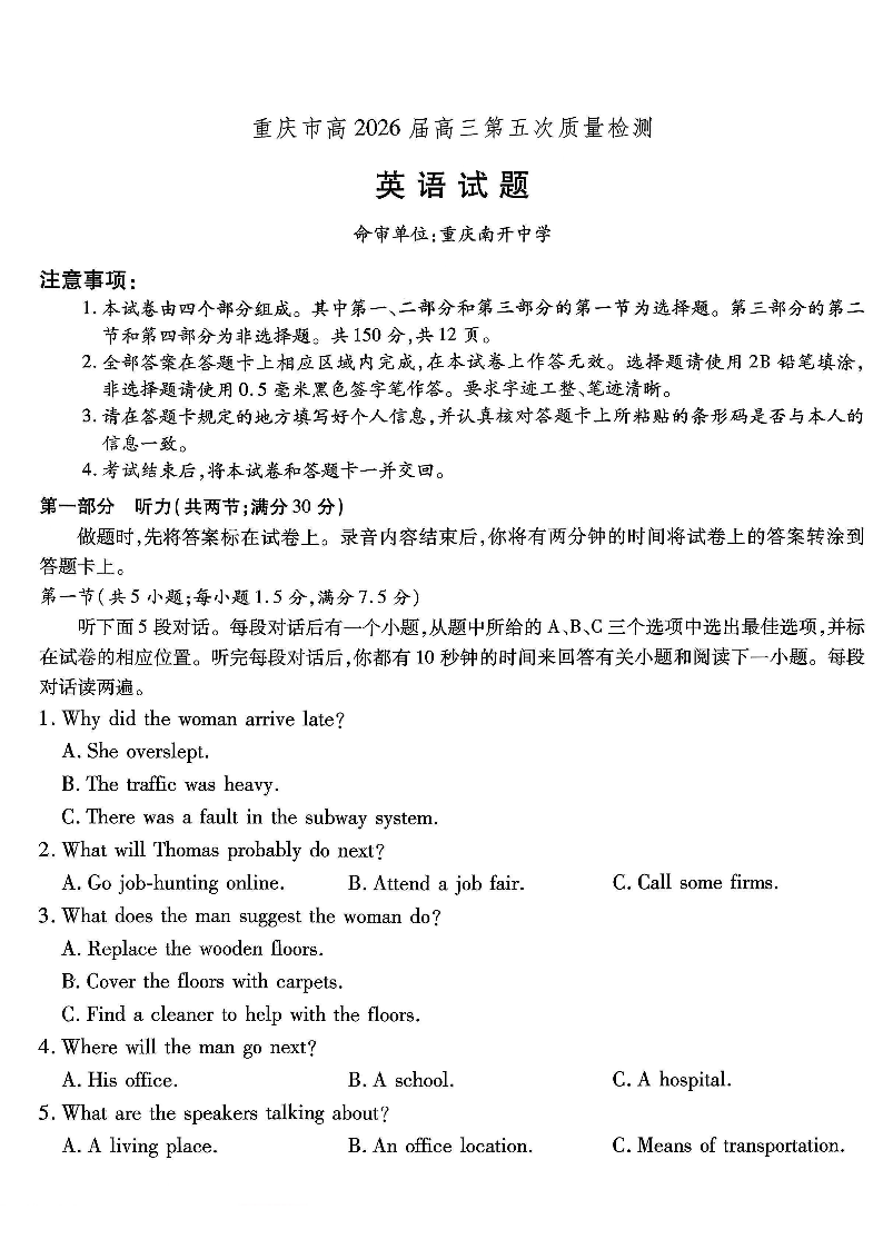 重庆市南开中学高2026届高三第五次质量检测 英语.pdf