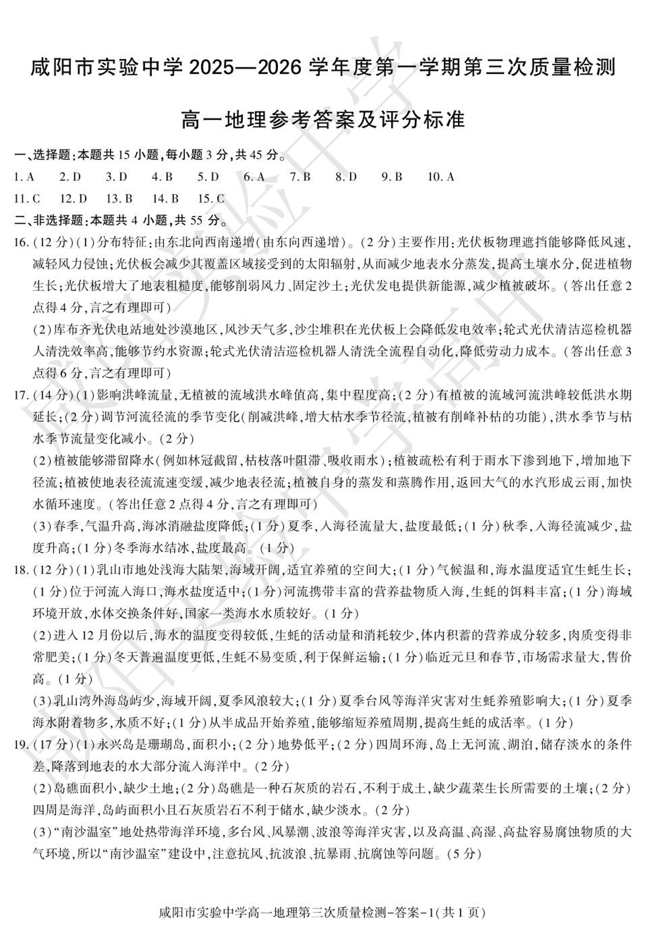 咸阳市实验中学2025-2026学年高一上学期第三次质量检测 地理答案.pdf