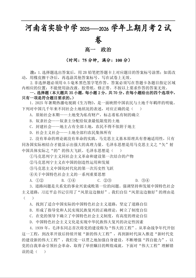 河南省实验中学2025-2026学年高一上学期第二次月考 政治.docx
