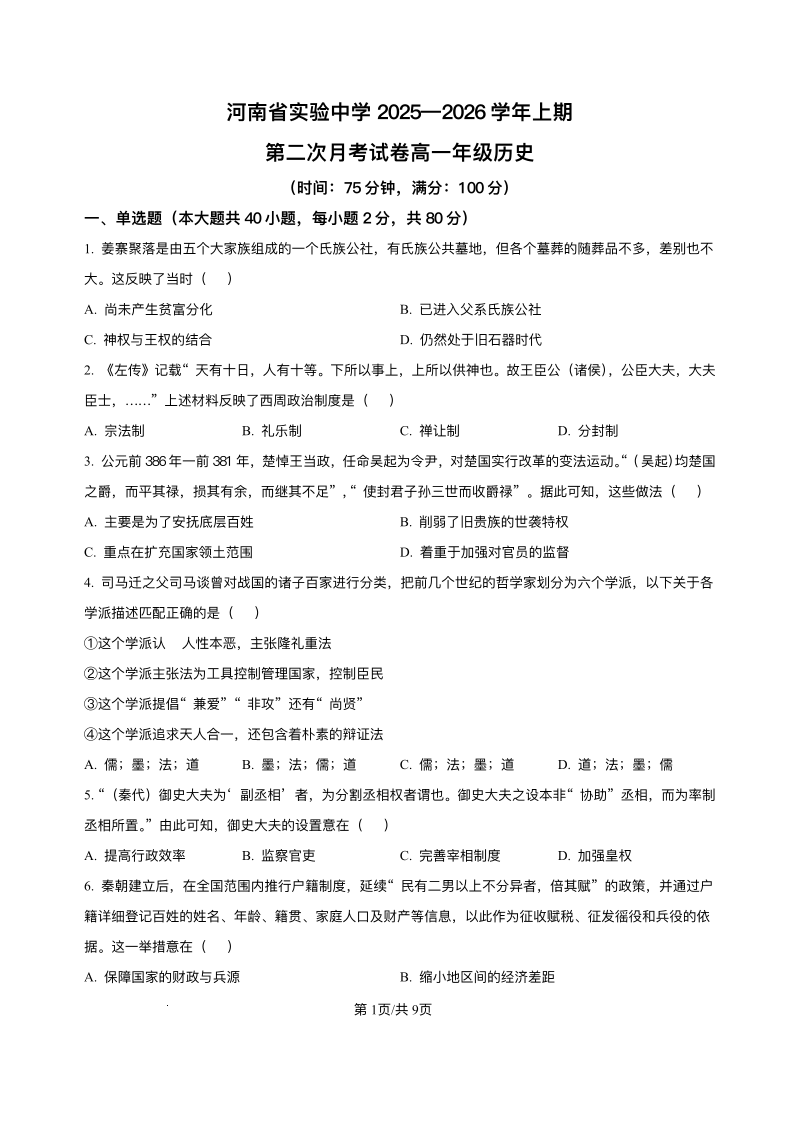 河南省实验中学2025-2026学年高一上学期第二次月考 历史.pdf