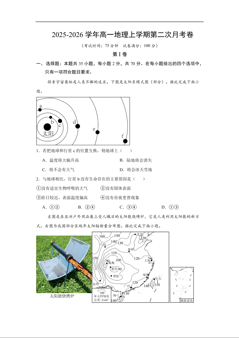 河南省实验中学2025-2026学年高一上学期第二次月考 地理.docx
