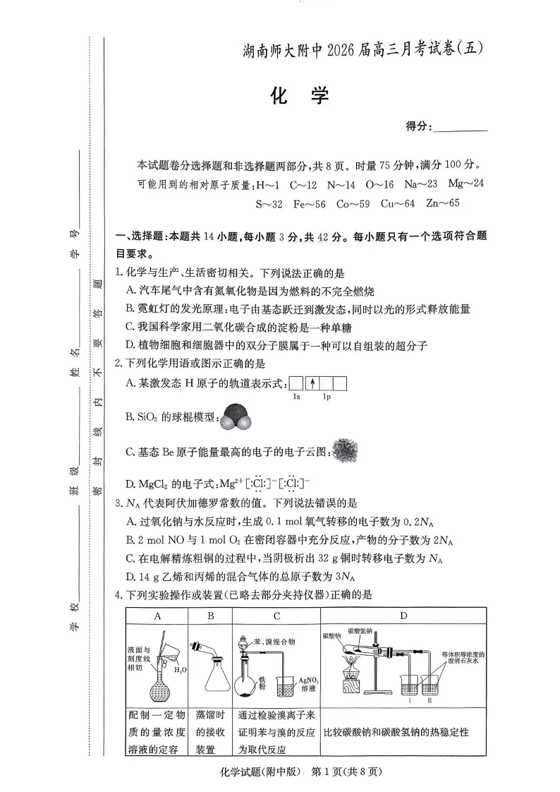 湖南师大附中2026届高三月考试卷(五)化学.pdf