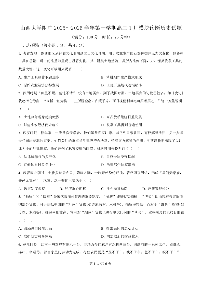 山西大学附中2025-2026学年第一学期高三1月模块诊断 历史.docx