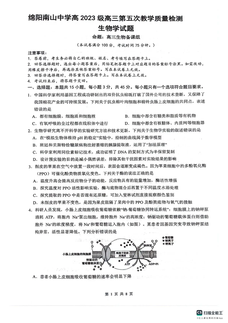 绵阳南山中学高2023级高三第五次教学质量检测 生物.pdf