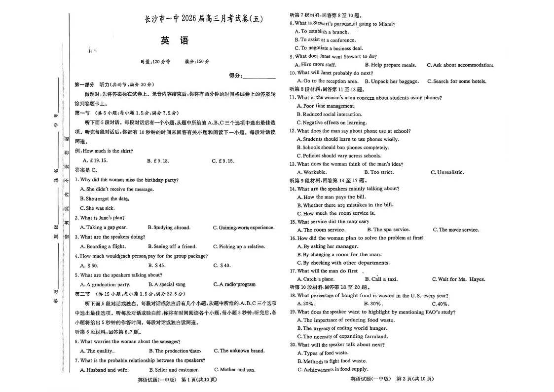 长沙市一中2026届高三月考试卷(五)英语.pdf