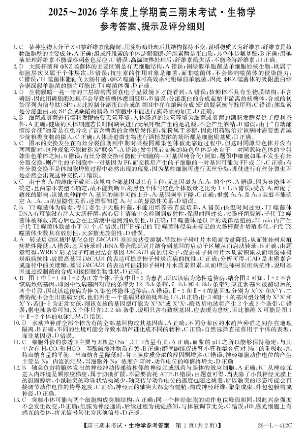 齐齐哈尔市2025~2026学年度上学期高三期末考试 生物答案.pdf