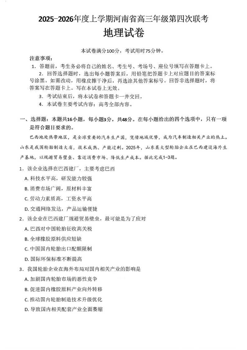 河南省2025—2026年度上学期高三年级第四次联考 地理.pdf