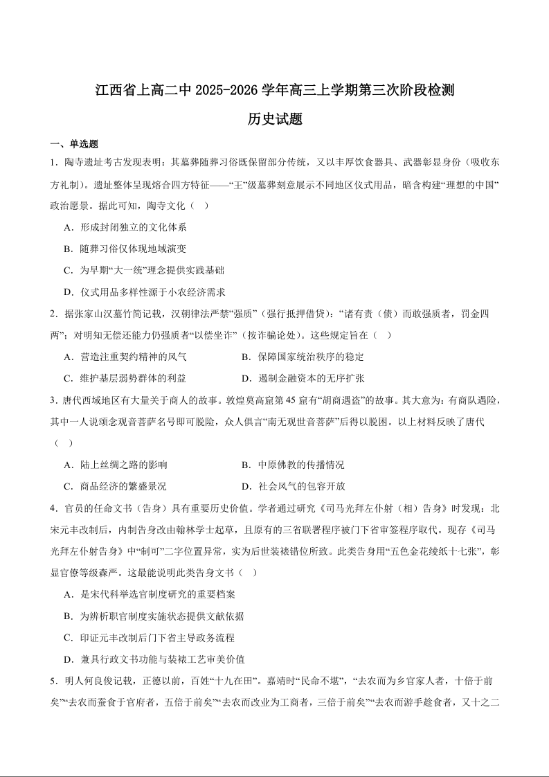 江西省上高二中2026届高三上学期第三次阶段检测 历史.docx
