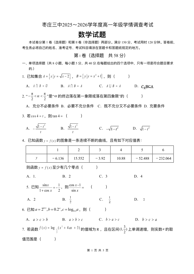 山东省枣庄市第三中学2025-2026学年高一年级学情调查考试 数学试题(含答案).pdf
