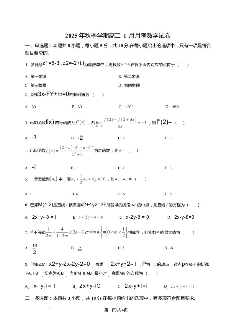 湖南省娄底市第一中学2025-2026学年高二上学期1月月考 数学试题(含答案).docx