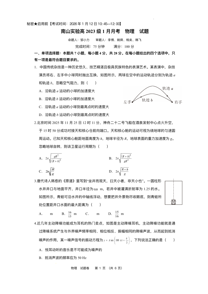 绵阳南山中学实验学校2025-2026学年高三上学期1月月考 物理试题(含答案).pdf