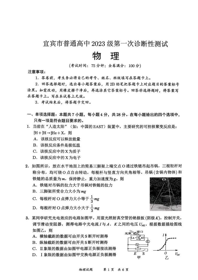 宜宾市普通高中2023级第一次诊断性测试 物理.pdf