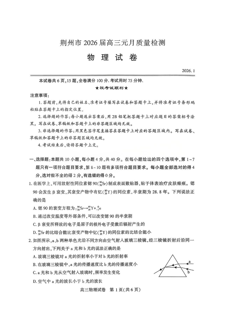 湖北省荆州、荆门、宜昌市2026届高三年级元月质量检测 物理试题(含答案).pdf