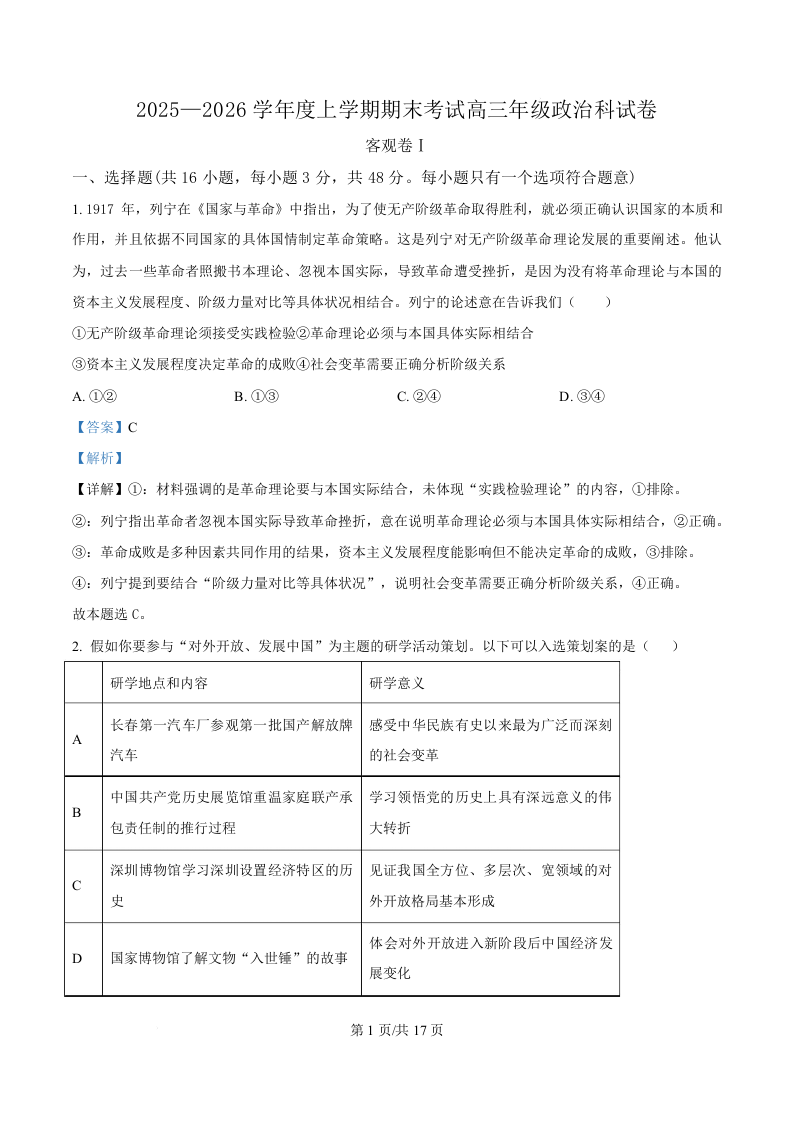 政治答案-2026届辽宁省五校联盟高三上学期期末考试试卷答案(东北育才省实验大连8、24中鞍山一中).docx