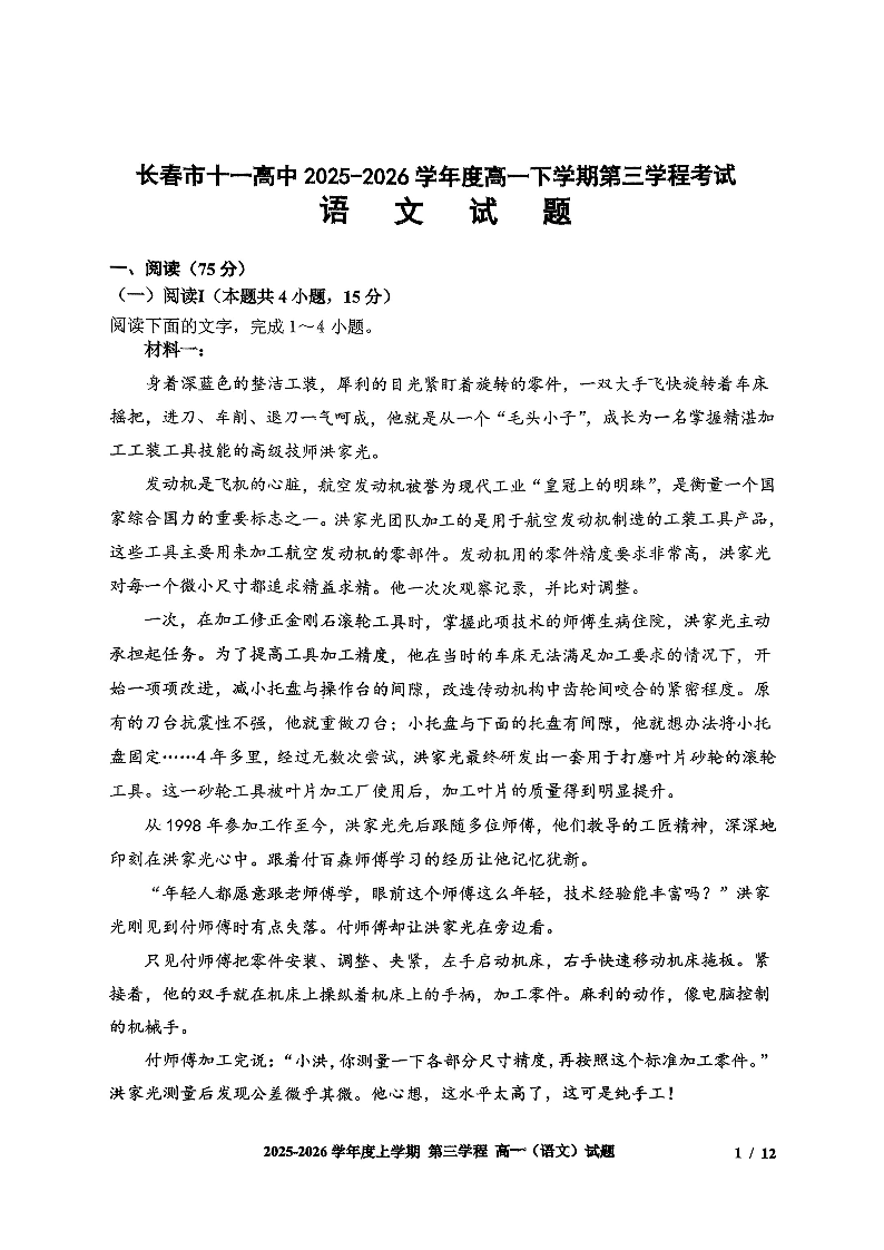 长春市十一高中2025-2026学年1月高一上学期第三学程考试 语文.pdf