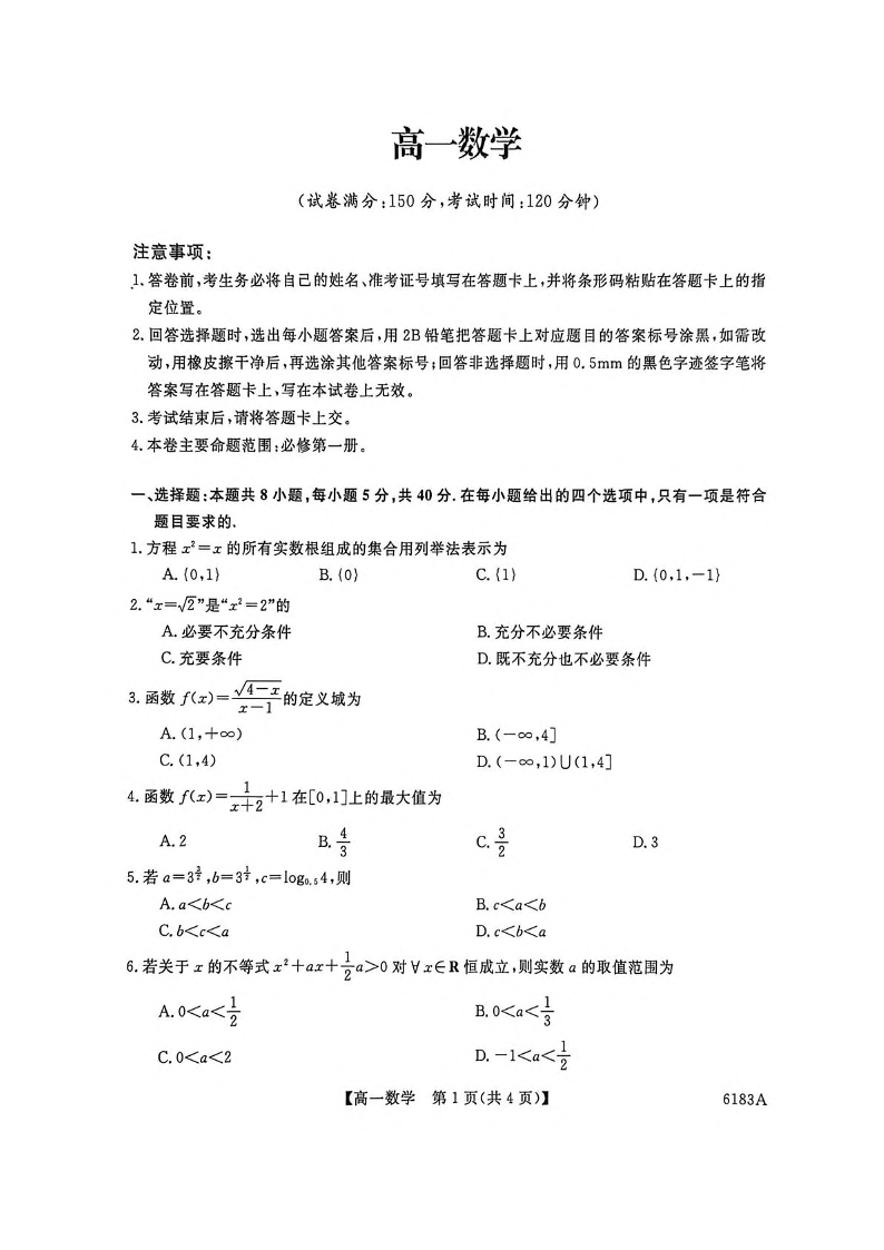 吉林市外五县2025-2026学年高一上学期1月期末考试 数学试题(含答案).pdf