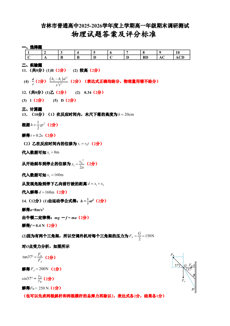 吉林省吉林市2025-2026学年高一上学期期末考试 物理答案.pdf