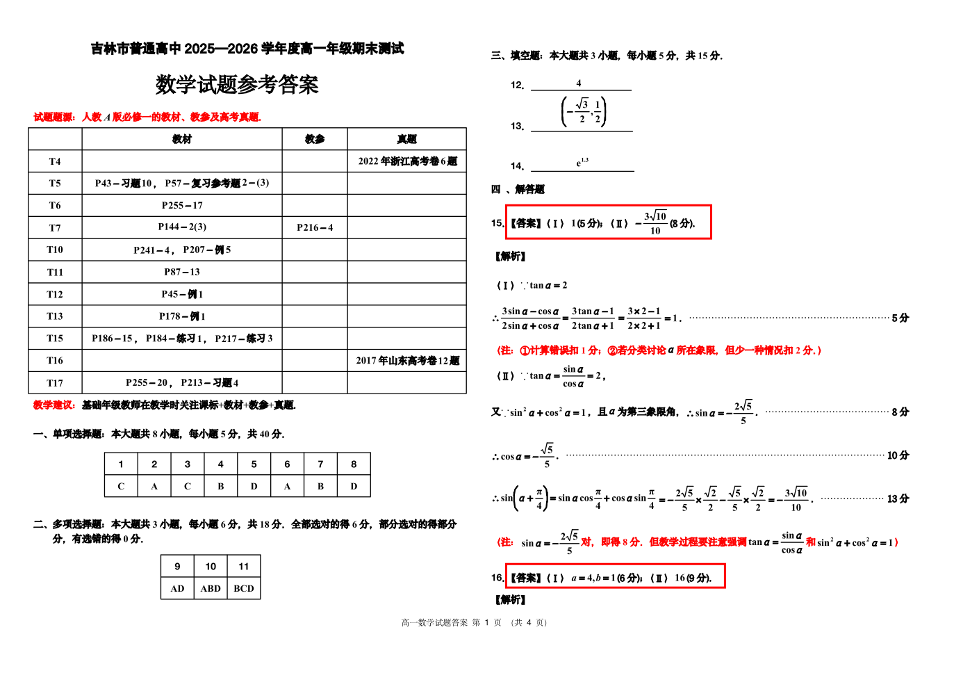 吉林省吉林市2025-2026学年高一上学期期末考试 数学答案.pdf