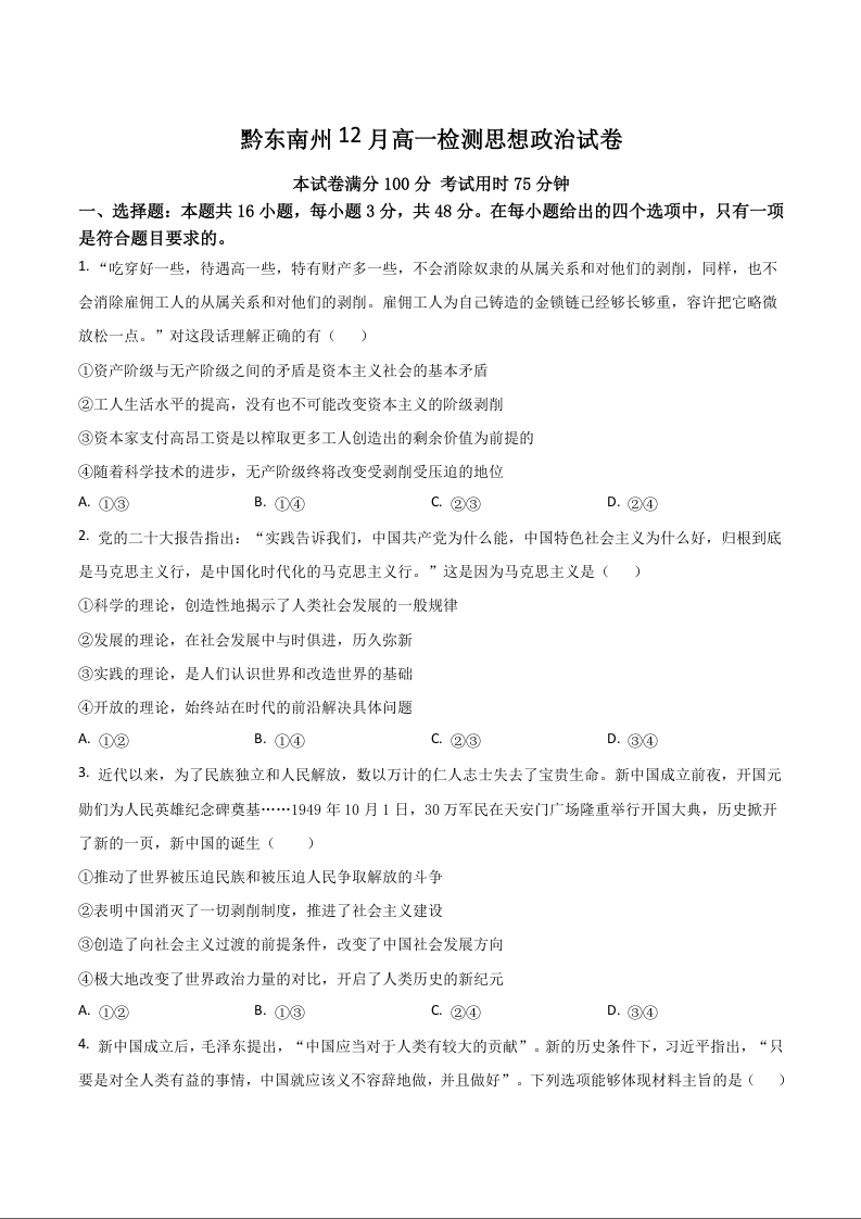黔东南州2025-2026学年高一上学期12月检测 政治.docx