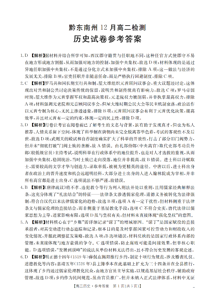 黔东南州2025-2026学年高二上学期12月检测 历史答案.pdf
