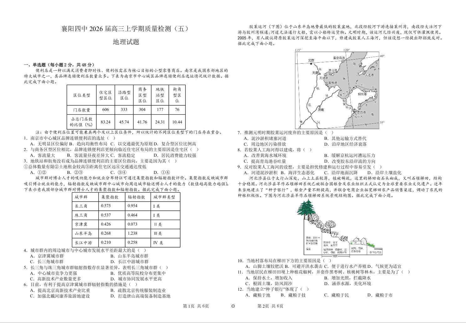 襄阳四中2026届高三上学期质量检测(五)地理试题(含答案).docx