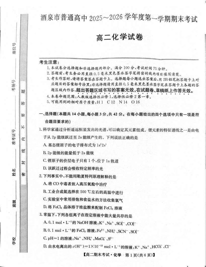 甘肃省酒泉市普通高中2025-2026学年高二上学期1月期末考试 化学试题(含答案).pdf