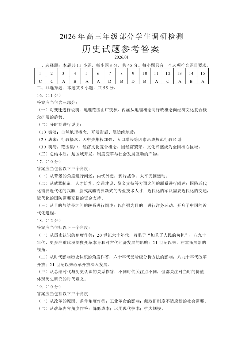 山东省青岛市2026年高三年级部分学生1月调研检测 历史答案.docx