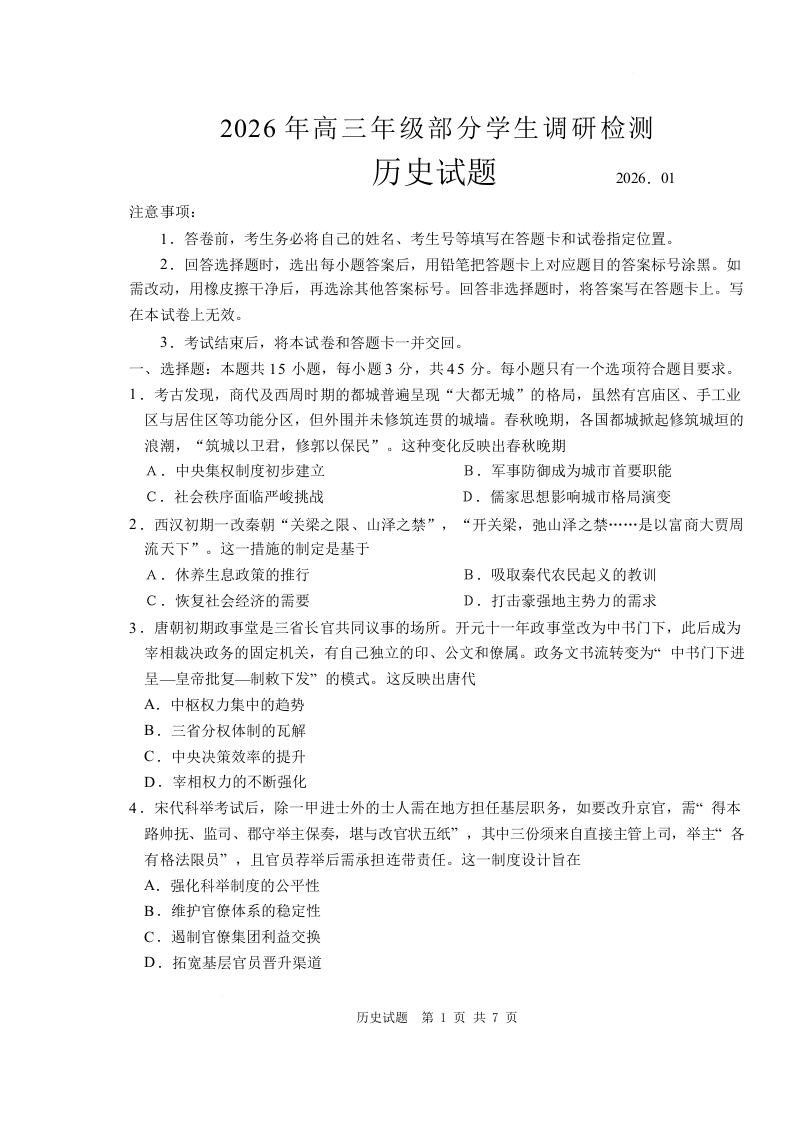 山东省青岛市2026年高三年级部分学生1月调研检测 历史.docx