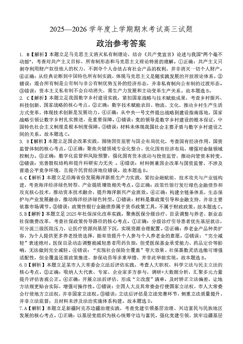 辽宁省协作校2025-2026学年度上学期高三年级期末考试 政治答案.pdf