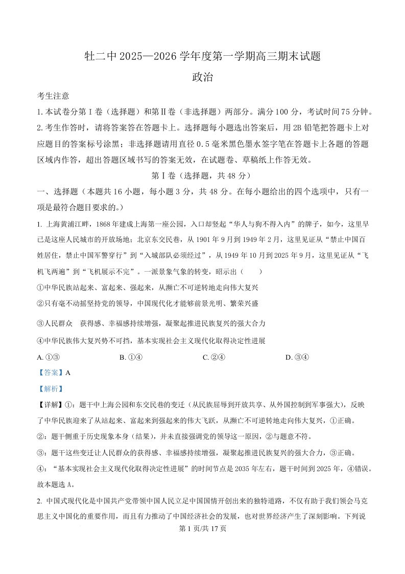 牡丹江二中2025-2026学年度第一学期高三年级期末试题 政治答案.docx