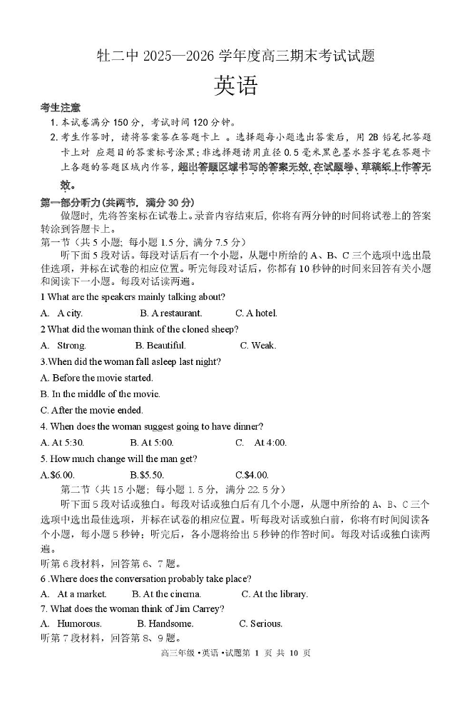 牡丹江二中2025-2026学年度第一学期高三年级期末试题 英语.pdf