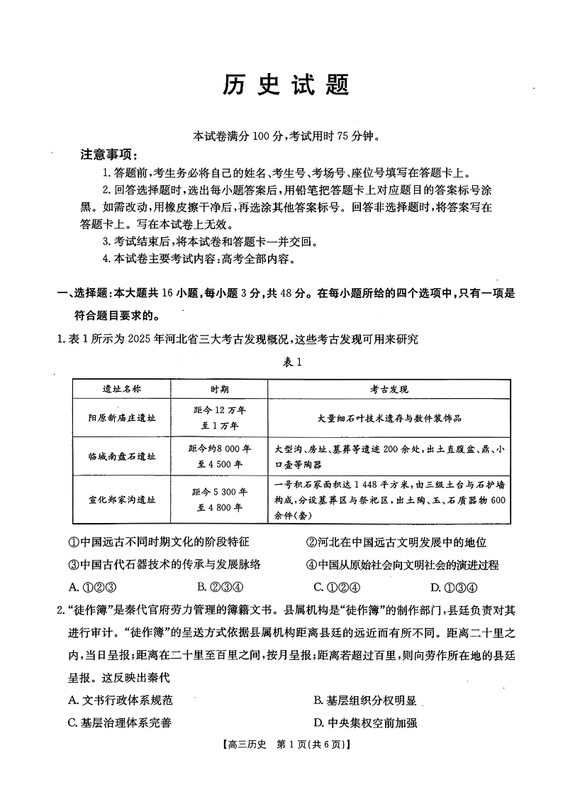 河北省五个一名校联盟2026届高三1月联考 历史试题(含答案).pdf