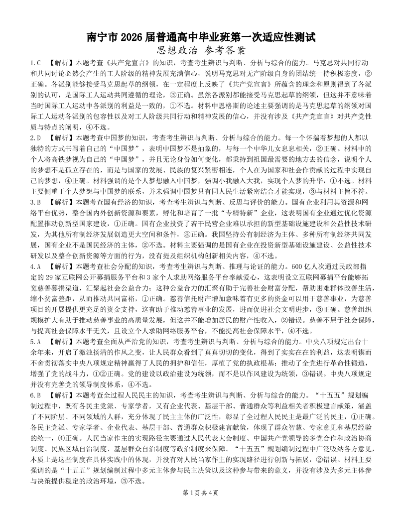 南宁市2026届普通高中毕业班第一次适应性测试 政治答案.pdf