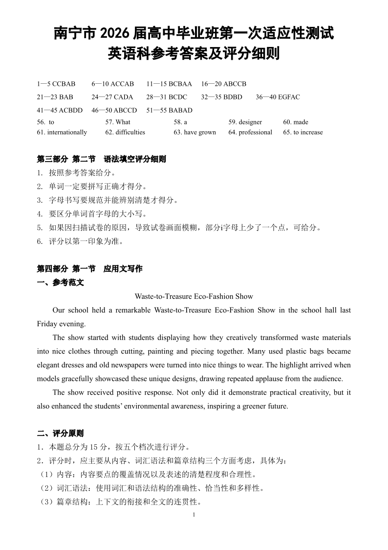 南宁市2026届普通高中毕业班第一次适应性测试 英语答案.pdf