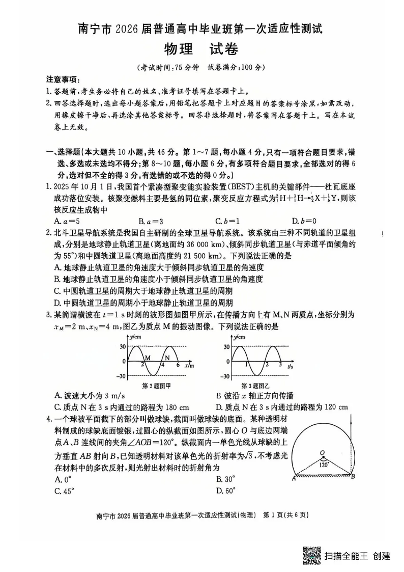 南宁市2026届普通高中毕业班第一次适应性测试 物理.pdf