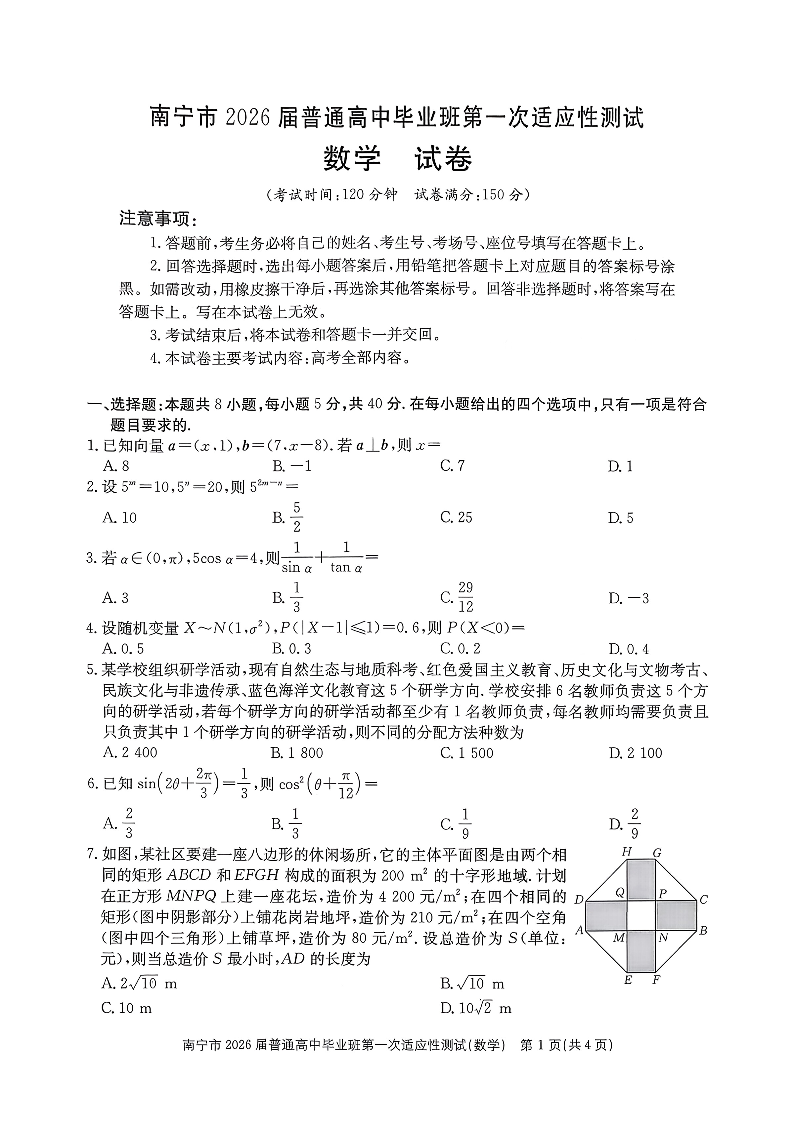 南宁市2026届普通高中毕业班第一次适应性测试 数学.pdf