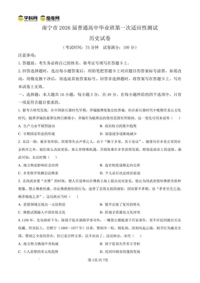 南宁市2026届普通高中毕业班第一次适应性测试 历史.pdf