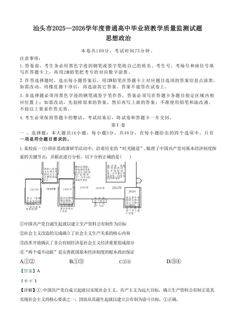 汕头市2025—2026学年度普通高中毕业班教学质量监测 政治试题(含答案).docx