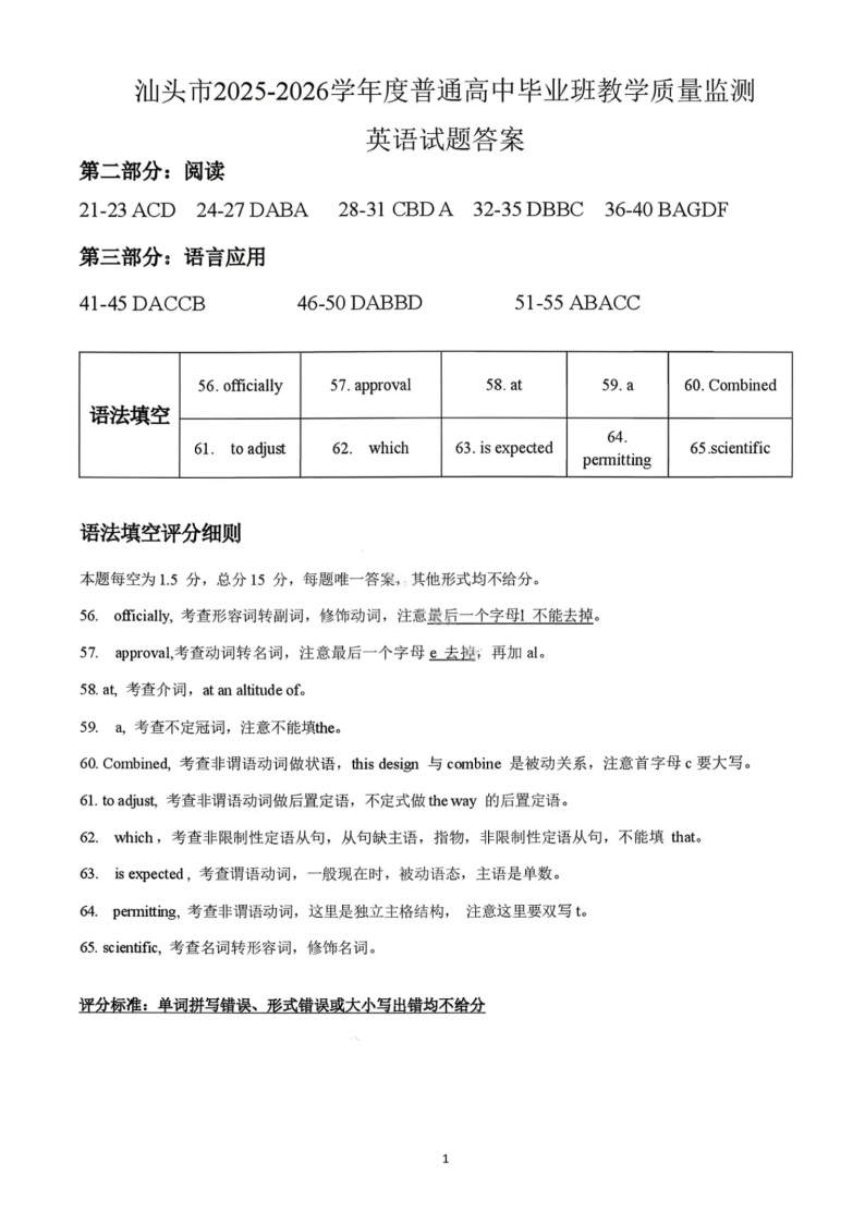 汕头市2025—2026学年度普通高中毕业班教学质量监测 英语答案.pdf